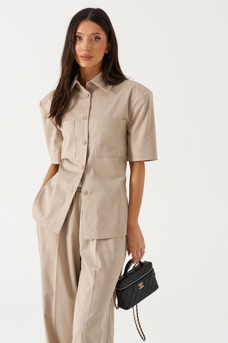 Блузка прямого силуэта выполнена из текстильного полотна песочного цаета в полоску. Характеристики: прямой крой, верх на подкладке, воротник отложной на стойке, рукав втачной, со спущенной линией плеча, подплечики, по переду по линии груди накладные карманы, по спинке талиевые вытачки, застежка центральная, застегивающаяся на петли, пуговицы. Длина рукава 28см, длина изделия 65см.