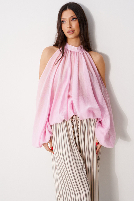 Блуза свободного кроя. Выполнена из прозрачной ткани розового цвета. Воротник стойка. Низ изделия на резинке. Застёжка сзади на стойке - пуговички. Рукав-реглан, с открытыми плечиками, по низу на резинке. Длина рукава (от воротника) 73 см. Длина спинки 73 см.