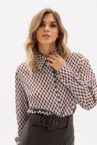 Блузка прилегающего силуэта, лиф имитирует корсет, без рукавов. Полочка лифа с рельефом и отрезным бочком низ лифа фигурный. Спинка лифа с рельефом и отрезным бочком, и застежкой на потайную тесьму-молнию в центральном шве. Полочка и спинка с вырезом каре по горловине и баской-балон по низу блузки. Блузка на подкладке из основной ткани.