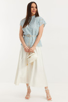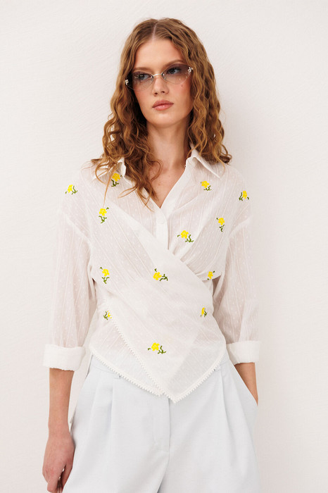 Блузка прямого силуэта, с втачным одношовным рукавом, внизу со складкой и манжетой и с застежкой на петлю-пуговицу. Полочка с центральной застежкой на петли-пуговицы (3шт), внизу завязка, которую можно завязать придав блузке другой внешний вид. По переду вышивка "Цветочки". По спинке кокетка и встречная складка от кокетки. Спинка с фигурным низом. Воротник рубашечный отложной на стойке. Внизу по боковым швам обработаны высокие разрезы. По спинке, полочке и разрезу настрочено кружево.