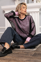 Блузка выполнена из тонкого трикотажного полотна в комбинации с отделочной тканью в пайетки.