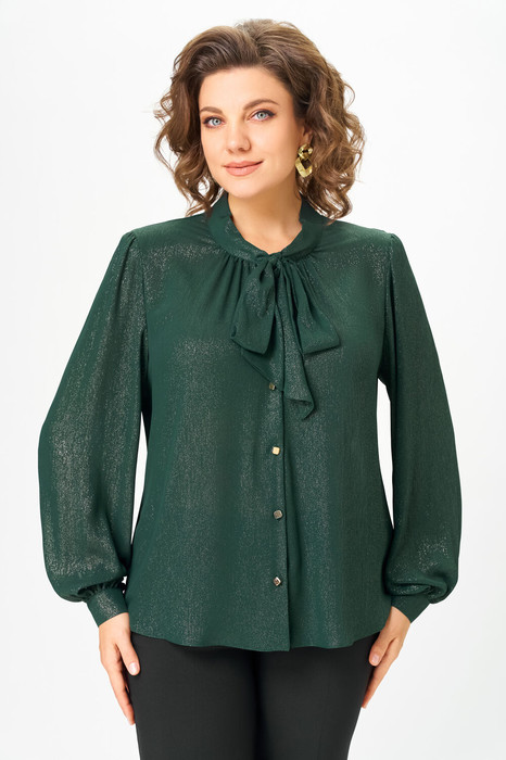 Блузка женская прямого силуэта, с центральной застежкой по переду на петли и пуговицы. По горловине переда-легкая сборка, воротник стойка, переходящая в бант.