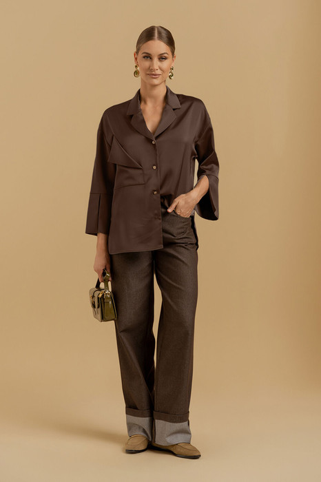 Блузка женская свободного силуэта из атласной ткани. Вырез горловины оформлен воротником пиджачного типа с застежкой на петли с пуговицами. Рукава- отрезные на базе цельнокроеных с отрезными манжетами с разрезами. В боковых швах выполнены разрезы. Передняя половинка декорирована настрочным декоративным элементом.