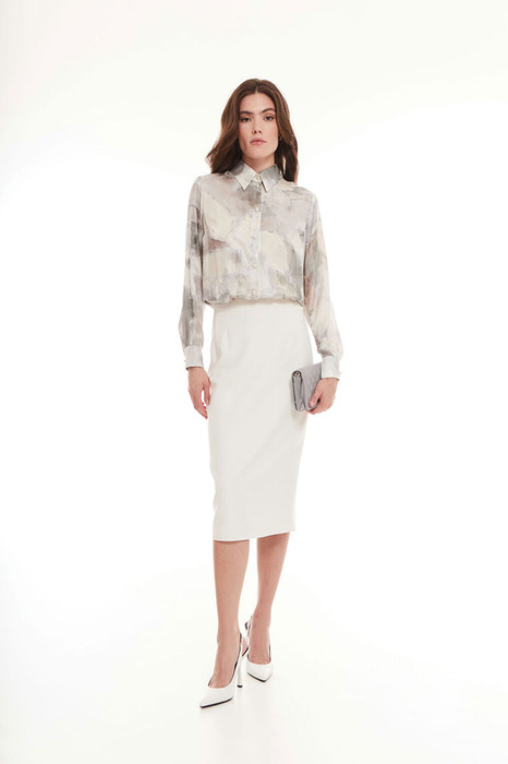 Элегантная женская блузка прямого кроя с изящными разрезами по бокам. Длинные втачные рукава с аккуратными манжетами, застегивающимися на пуговицу. Классический рубашечный воротник и застежка на петли и пуговицы создают утончённый образ. Спинка украшена кокеткой и встречной складкой, добавляющей изюминку и комфорт. Идеальный выбор для стильных и уверенных женщин.
