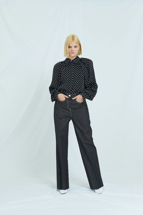 Блузка женская прямого силуэта. Воротник рубашечный. Застежка потайная на петли и пуговицы. Рукава реглан, с притачной манжетой на 2 петли и пуговицы.