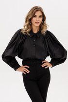 Блузка из выполнена из плательно-блузочной ткани в мелкую полоску. Блузка Х-образного силуэта, длиной до линии бедер. По переду обработана центральная застежка встык на две навесные петли и пуговицы. Спинка цельная. Горловина округлой формы. Плечевой шов удлинен. Рукав покроя кимоно, одношовный, расширенный и присборенный по низу с эластичной тесьмой. Низ рукава декорирован бантиком из основной ткани. Низ блузки фигурной формы. По линии талии обработана кулиса со шнуром из основной ткани.