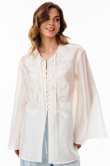 Блузка выполнена из полупрозрачной плательно-блузочной ткани. Блузка А-образного силуэта, длиной ниже линии бедер. По переду обработана центральная застежка встык на навесные петли и пуговицы. Спинка цельная. Горловина округлой формы с завязками по переду. Плечевой шов удлинен. Рукав рубашечного покроя, одношовный, расширенный к низу. В боковых швах обработаны разрезы. Блузка декорирована по переду вышивкой.