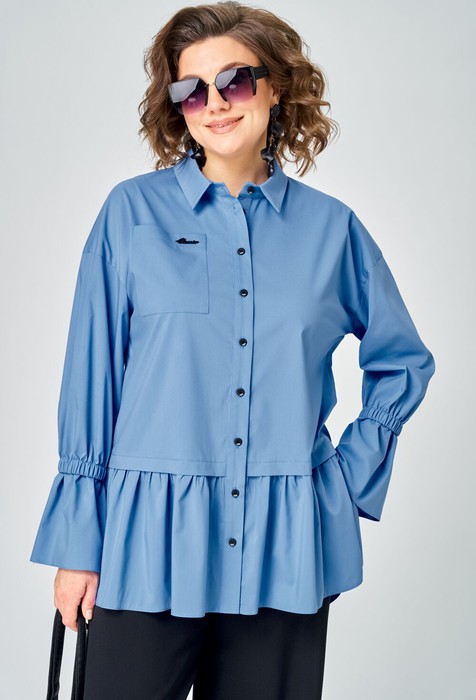 Блузка женская нарядно повседневного элегантного стиля, прямого силуэта с фигурным низом выполнена из шикарного дышащего хлопка. Вырез горловины воротник на стойке рубашечного типа, застежка доверху на обметанные петли и пуговицы. Рукав спущенный, втачной по низу на притачной манжете, в боковых швах обработаны разрезы. На полочке функциональный накладной карман, изящная металлическая бренд лейбл и контрасные пуговицы придают изделию стильный и современный дизайн. Подрез по полочке делает изделие трендом сезона. По спинке фигурная кокетка и встречная складка, создают идеальную посадку. Универсальный силуэт, элегантный крой, стильный дизайн - все детали только подчеркивают достоинства фигуры, а фасон создает трендовый образ.
