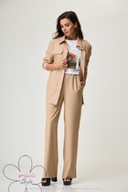 Блузка с втачным воротником с отрезной стойкой, верхняя часть переда с запахом и застежкой на одну петлю и пуговицу. По шву притачивания верхней части переда к нижней- сборка в области груди. Нижняя часть спинки присборена несколькими рядами резинки. Из боковых швов выходит пояс- завязка. Рукав втачной, длинный, с отрезной манжетой. По шву притачивания манжеты рукав присборен