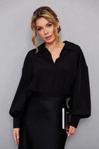 Широкие рукава, собранные на изящные манжеты, и классический отложной воротник придают образу ретро-флер и благородную строгость. В то же время глубокий вырез по переду мягко балансирует этот объем, добавляя женственности и открытости.