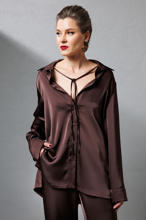 Атласная блузка - трансформер. Блузка свободного кроя. Можно сделать ее более приталенной, застегнув потайной ремешок, или завязать внутренние ленты и спустить рубашку на плечи, для более расслабленного образа. Длина блузки - 73 см.