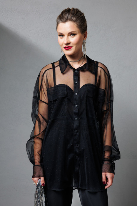 Прозрачная рубашка в мерцающую сетку прямого силуэта. По переду накладные карманы с клапанами. Рукав длинный на манжете. Застежка на пуговицах. Под нее можно надеть укороченный топ или майку на бретелях. Сексуальный образ вам обеспечен.