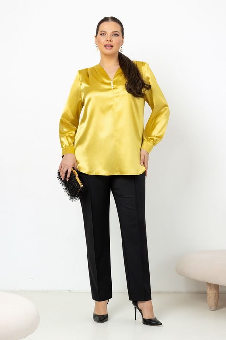 Элегантная дизайнерская блузка со складками выполнена из нежного щелк атласа с матовым блеском и декором из жемчуга отлично впишется в ваш гардероб, легко сочетать как с брюками так и с юбкой. Блузка прямого силуэта со средним швом и V-образным вырезом с мягкими складками по горловине от плечевого шва, средний шов украшен пришитыми жемчужинами. Спинка цельная, линия низа фигурная. Рукав втачной с притачной манжетой, застегивается на жемчужные пуговицы.