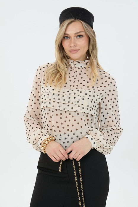 Элегантная блуза из легкой ткани свободного силуэта с принтом "горох". По переду блузки добавлен оригинальный элемент в виде складок.