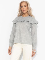 Изящная женская блуза в серо-синем цвете элегантного дизайна станет прекрасным дополнением вашего гардероба. Особое внимание привлекает горловина, обработанная нежной рюшей. Этот элемент добавляет блузе женственности и романтичности, делая образ более утонченным. По переду блузы расположен V-образный вырез, который визуально удлиняет шею и подчеркивает зону декольте. Он плавно переходит в аккуратную планку, добавляя завершенности и изысканности. Создавайте утонченные образы вместе с нашей очаровательной блузой!