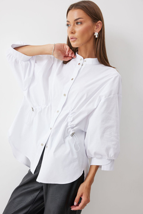 Блузка прямого силуэта из хлопковой ткани с фигурным низом. Воротник –стойка, по центру застежка на кнопки. Рукав спущенный с заниженной проймой, по низу рукава сборка и декоративная манжета. По переду декоративная кулиса с фиксаторами для регулирования степени прилегания изделия. На спинке кокетка и сборка по центру. Обращаем ваше внимание, что фурнитура может отличаться от фото.
