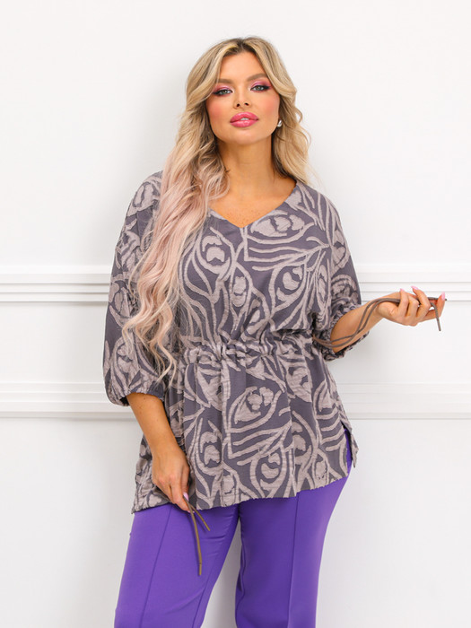 Роскошная туника прямого силуэта из текстильной ткани серого цвета. V-образный вырез обработан внутренней обтачкой. Цельнокроеные рукава обработаны резинкой. Линия талии эффектно подчеркнута кулиской со шнурками. Длина изделия по спинке от плечевого шва до низа изделия — см.