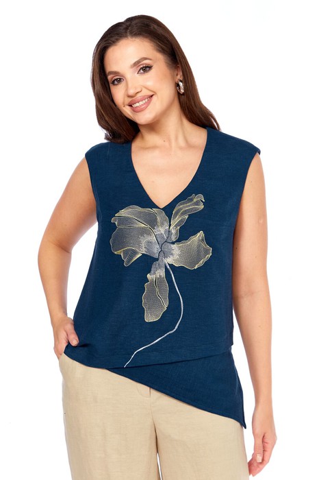 Блуза прямого силуэта. По переду нагрудные вытачки от боковых швов, декоративная вышивка. Низ ассиметричный с отрезной деталью. разрез в левом боковом шве. Плечо слегка спущено. Горловина с V- образным вырезом.