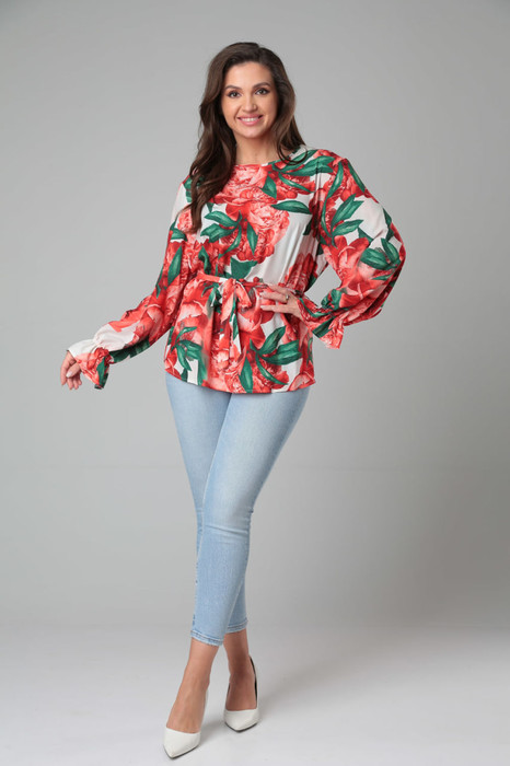 Блузка свободного кроя. Полочка с нагрудными вытачками. Горловина и разрез на застежку по спинке обработан косой бейкой из основной ткани, разрез с навесной петлей на пуговицу. Рукав прямой, длинный, втачной, со сборкой на эластичную ленту в 8см от края рукава.  По линии талии на  боковых  швах настрочены шлевки и вдет пояс из основной ткани. Низ изделия фигурный с разрезами в боковых швах.