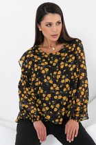 Блуза прямого свободного кроя с округлым вырезом горловины с декоративной нашивкой. По переду две отлетные складки в рельефе. Рукава втачные длиной три четверти. По низу изделия притачной волан из трикотажного гофре.