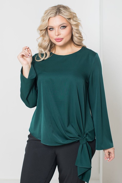 Нарядная блузка свободного силуэта, выполнена из шелковистой эластичной плательной ткани. Перед и спинка блузки целые. Рукав втачной длинный, слегка расклёшенный к низу. Длина рукава от плечевой точки в 46 р-ре – 59 см. в 60 р-ре – 62 см., ширина рукава по низу в 46 р-ре – 32 см. в 60 р-ре – 42 см. Овальный врез горловины переда и спинки обработан обтачками. Низ блузки фигурный с оригинальной цельнокроеной деталью, которая позволяет красиво задрапировать перед блузки. Блузка без застежек и подклада. Длина изделия по спинке в 46 р-ре – 60 см. в 60 р-ре – 66 см.