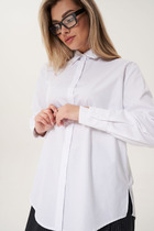 Элегантная блузка прямого силуэта, выполнена из шелковистой эластичной плательной ткани. Перед и спинка блузки целые, по переду две нагрудные вытачки. Круглый вырез горловины переда и горловина спинки обработаны обтачками. По горловине спинки небольшой щелевидный разрез с застежкой на воздушную петлю и пуговицу. Особую элегантность блузке придает втачной длинный рукав с притачным манжетом по низу. Вертикальный разрез по всей длине передней части рукава и сборка по шву притачивания манжеты делают рукав свободным и удобным в носке. Манжеты с застежкой на петли и пуговицы. Длина рукава от плеча в 46 р-ре – 60 см. в 62 р-ре – 63 см., ширина рукава по низу в 46 р-ре 20 см. в 62 р-ре – 24 см. Блузка без подклада. Длина изделия по спинке в 46 р-ре – 63 см. в 62 р-ре – 72 см.