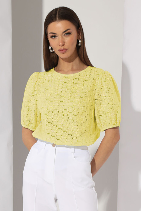 Блуза прямого силуэта, слегка расширена к низу. Выполнена из хлопковой ткани решелье. Горловина округлой формы, на спинке переходящая в капельку с застежкой на петлю и пуговицу. На переде расположены нагрудные вытачки, идущие из бокового шва. Рукав втачной, короткий, со сборкой по окату и резинкой по низу.