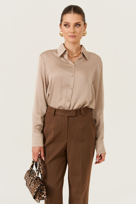 Эта стильная женская блузка бежевого оттенка идеально подойдет для повседневной носки. Выполненная в прямом силуэте, она обеспечивает комфорт и свободу движений. Ткань поливискозная, струящаяся, что придает изделию легкость и изящность. Перед украшен центральной бортовой застежкой на обметанные петли и пуговицы, а низ изделия выполнен с закругленным краем, добавляя изящества образу. Горловина оформлена классическим рубашечным воротником, а рукава завершены притачными манжетами с застежками на две обметанные петли и пуговицы — практично и стильно. Эта очень легкая и практичная блузка станет отличным выбором для ежедневных образов, сочетая комфорт с элегантностью и привлекательностью.