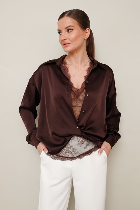 Элегантная блузка прямого кроя, выполнена из струящейся ткани с благородным матовым блеском. Горловина с рубашечным воротником на отрезной стойке, центральная застежка на петли и пуговицы. Перед блузки выполнен с декоративным перекрутом в низжней части застежки. Рукава со спущенной линией втачивания плеча, манжеты с застежкой на петли и пуговицы. Спинка с отрезной кокеткой и бантовой складкой.