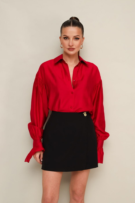 Акцентная блузка прямого кроя, выполнена из натуральной невесомой ткани с матовым блеском. Горловина с рубашечным воротником на отрезной стойке, центральная застежка на петли и пуговицы. Рукава со спущенной линией втачивания плеча, манжеты с рюшей с застежкой на навесные петли и пуговицы.
