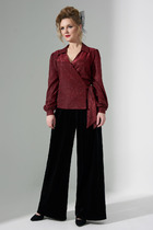 Блуза женская из текстильной ткани. Прямого силуэта. По спинке расположен подрез. В шов вставлено кружево. Рукав 3/4, спущенный с манжетой. По плечевому шву вставлено кружево. Вырез лодочка. Обработан притачной бейкой.