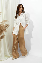 Базовую женскую блузку из льна можно заправить и тем самым подчеркнуть талию, или носить расслаблено на выпуск — низ на резинке позволяет чувствовать комфорт при носке в любом виде.