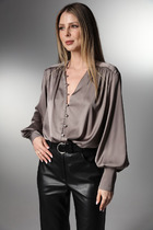 Блузка прямого силуэта с втачным рукавом. Горловина округлая с планкой по переду. Рукав длинный, по низу со сборкой и притачной манжетой с застежкой на петлю и пуговицу. Рукав и нижняя деталь спинки из сетки. Низ блузки асимметричный, спинка длиннее переда. Планка по горловине, низу переда и манжеты выполнены из отделочного материала.
