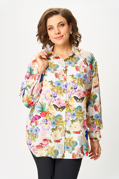 Блузка женская свободного силуэта, выполнена из легкой хлопковой ткани. Горловина с отложным воротником на стойке. Застежка центральная на петли и пуговицы. Спинка с кокеткой и складкой из-под кокетки. Плечо спущенное, линия проймы углубленная. Рукава длинные на манжете, с застежкой на петлю и пуговицу. Линия низа фигурная.