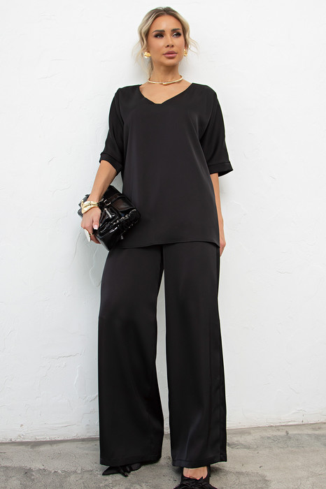 Универсальная блузка прямого кроя выполнена из атласной ткани. Цельнокроенный короткий рукав оканчивается притачной манжетой. V-образная горловина на внутренней обтачке. Низ ровный, без разрезов.