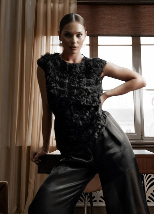 Блузка прямого силуэта со спущенным плечом. Перед из фактурной ткани «розы на сетке», спинка из полупрозрачной ткани «органза».  Горловина округлой формы, по спинке застежка на навесную петлю и пуговицу. Перед на атласной подкладке. Длина 59 см.