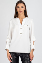 Низ рукава с петелькой и притачной манжетой, которая застёгивается на две пуговицы, завершая гармоничный образ блузки.