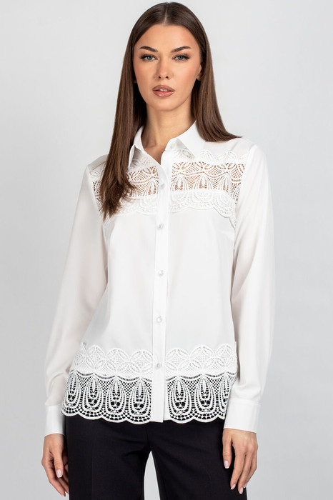 Передняя часть c нагрудными выточками, обеспечивающими комфортную посадку. Центральная бортовая застёжка — на 6 или 7 пуговиц (в зависимости от размера), придаёт образу классическую завершённость. Особое внимание привлекает кружево, изящно нашитое в верхней и нижней части переда — оно добавляет лёгкости и утончённости, делая блузку особенно женственной.