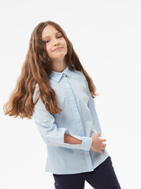 Трикотажная блуза из линейки VAY KIDS школа. Отложной воротничок с застежкой на пуговицы и ажурной отделкой.