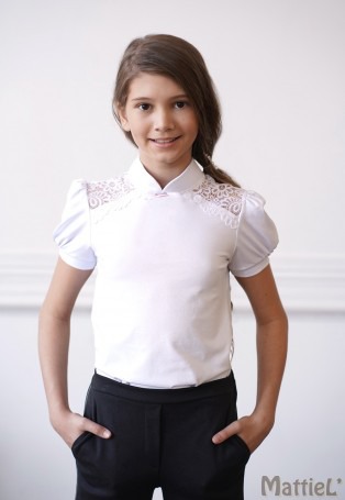 Блузка нарядная для девочек из высококачественного трикотажа(кулирка качество пенье). Блузка с воротником-стойка и застежкой сзади. Рукав короткий на манжете, кокетка на полочке выполнена из ажурного кружева. Блузка украшена брошкой. Трикотажная блузка не деформируется после стирки, очень удобна и комфортна для вашего ребенка. Отличное решение для торжественного случая.