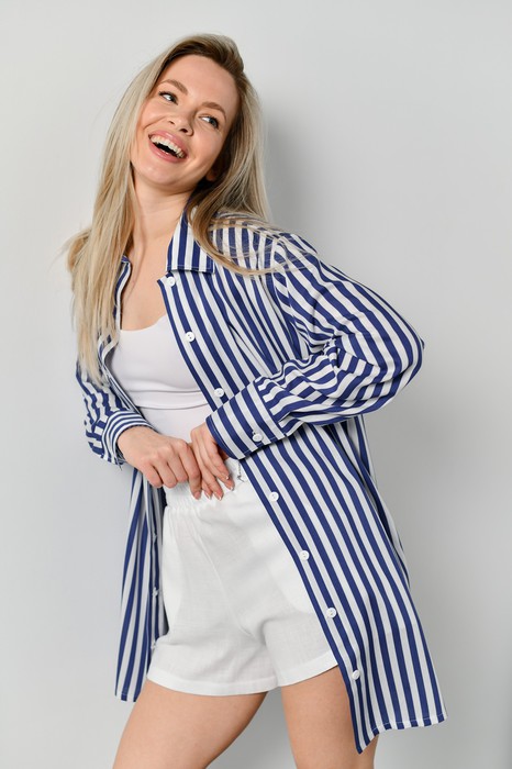 Блузка-рубашка женская из штапельного полотна с набивным рисунком «полоска», свободного кроя, удлиненная, со стояче-отложным воротником, спущенным длинным рукавом. Перед из двух частей с центральной бортовой застежкой на петли и пуговицы, спинка цельнокроеная. Низ рукава с притачной манжетой, застегивающейся на петлю и пуговицу.