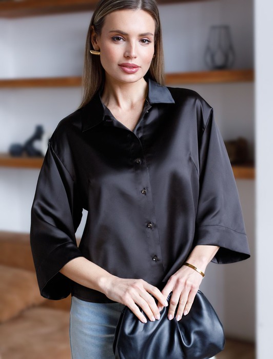 Состав: 97%ПЭ 3%ПУ Плотность: 190 Г/м2Элегантная блузка черного цвета на пуговицах выполнена из плотного струящегося сатина, который мягко ложится по фигуре и создает эффектную посадку. Отложной воротник придает образу женственную и изящную нотку. Материал отличается дышащей структурой, благодаря чему комфорт сохраняется даже в течение всего дня. Широкие рукава обеспечивают свободу движений и подходят для полных рук, делая блузку универсальной для разных типов фигур, в том числе для больших размеров. Красивая гладкая фактура материала подчеркивает утонченность изделия, добавляя легкое сияние к любому образу. Благодаря продуманному крою эта рубашка смотрится стильно как в повседневной жизни, так и на особых мероприятиях. Ткань практична, она приятна на ощупь, легко ухаживается и долго сохраняет первоначальный вид даже после многократных стирок и активной носки.