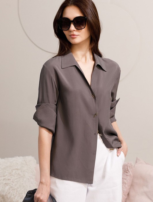 Состав: 55%Вис 45%Лиоцелл (Вис) Плотность: 115 Г/м2Блузка кофейного цвета сочетает в себе комфорт и элегантность благодаря материалу из вискозы с лиоцеллом. Аккуратный отложной воротник подчеркивает утонченность образа, а продолговатые металлические пуговицы золотистого цвета добавляют выразительный акцент и придают блузке благородный вид. Широкие манжеты на рукавах привлекают внимание и делают силуэт современным. Спущенная линия плеча формирует расслабленный, но стильный внешний вид, что идеально для тех, кто ценит индивидуальность и уверенность в деталях. Крой продуман так, чтобы подчеркивать достоинства фигуры и на больших размерах, создавая гармоничный силуэт без лишних усилий. Ткань из вискозы с добавлением лиоцелла обеспечивает приятные ощущения и отличную посадку, струится на теле и охлаждает в жаркую погоду. При пошиве использована технология «чистый край» по всей длине центральной планки и низу изделия. Это признак премиум качества — «чистый край» вместо оверлока. Блузку можно носить с топом, не застегивая — при этом распахнутая блузка будет выглядеть максимально эстетично.Рубашка легко впишется как в деловой гардероб, так и в повседневный стиль, позволяя выглядеть безупречно независимо от ситуации.
