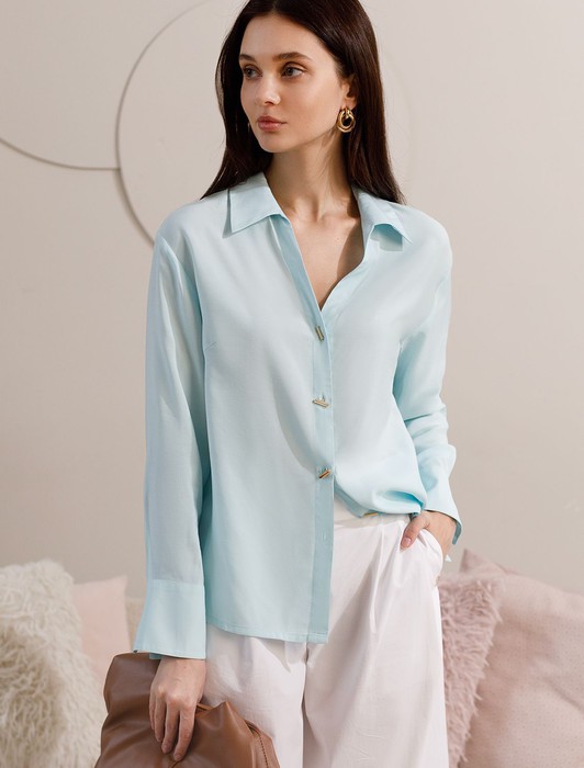Состав: 55%Вис 45%Лиоцелл (Вис) Плотность: 115 Г/м2Блузка светло-лазурного цвета сочетает в себе комфорт и элегантность благодаря материалу из вискозы с лиоцеллом. Аккуратный отложной воротник подчеркивает утонченность образа, а продолговатые металлические пуговицы золотистого цвета добавляют выразительный акцент и придают блузке благородный вид. Широкие манжеты на рукавах привлекают внимание и делают силуэт современным. Спущенная линия плеча формирует расслабленный, но стильный внешний вид, что идеально для тех, кто ценит индивидуальность и уверенность в деталях. Крой продуман так, чтобы подчеркивать достоинства фигуры и на больших размерах, создавая гармоничный силуэт без лишних усилий. Ткань из вискозы с добавлением лиоцелла обеспечивает приятные ощущения и отличную посадку, струится на теле и охлаждает в жаркую погоду. При пошиве использована технология «чистый край» по всей длине центральной планки и низу изделия. Это признак премиум качества — «чистый край» вместо оверлока. Блузку можно носить с топом, не застегивая — при этом распахнутая блузка будет выглядеть максимально эстетично.Рубашка легко впишется как в деловой гардероб, так и в повседневный стиль, позволяя выглядеть безупречно независимо от ситуации.