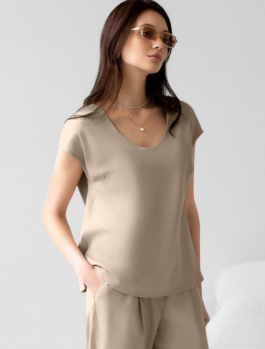 Состав: 76%Лиоцелл (Вис) 24%ПЭ Плотность: 180 Г/м2Элегантная блузка светло-бежевого цвета скроенная по косой выполнена из плотного лиоцелла. Лиоцелл это более дорогой и экологичный вариант вискозы, очень прочный и шелковистый. Эта повседневная блузка с трендовым U-вырезом создана для легкого и утонченного стиля. Мягкие линии кроя создают невероятно эффектный образ, который подчеркивает естественную красоту, не стесняя движений, а свободный фасон дарит ощущение абсолютного комфорта и уверенности. Блузка красиво драпируется при движении, создавая летящий, воздушный эффект. Эта легкая блуза с коротким рукавом идеальный выбор для комфорта и стиля в теплое время года, она будет идеальна для любого повода.