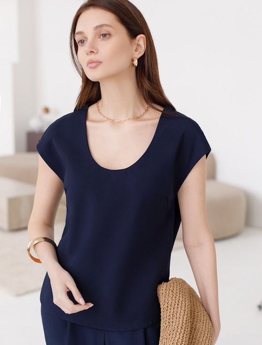 Состав: 76%Лиоцелл (Вис) 24%ПЭЭлегантная блузка темно-синего цвета скроенная по косой выполнена из плотного лиоцелла. Лиоцелл это более дорогой и экологичный вариант вискозы, очень прочный и шелковистый. Эта повседневная блузка с трендовым U-вырезом создана для легкого и утонченного стиля. Мягкие линии кроя создают невероятно эффектный образ, который подчеркивает естественную красоту, не стесняя движений, а свободный фасон дарит ощущение абсолютного комфорта и уверенности. Блузка красиво драпируется при движении, создавая летящий, воздушный эффект. Эта легкая блуза с коротким рукавом идеальный выбор для комфорта и стиля в теплое время года, она будет идеальна для любого повода.