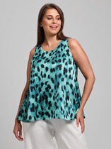 Блузка женская из тканого полотна «искусственный шёлк полиэстер» с набивным рисунком, расклешенного силуэта, без рукавов, с овальным вырезом горловины, окантованным основным материалом.