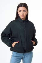 Бомбер выполнен из экокожи с теснением черного цвета цвета. Характеристики: отложной воротник, застёжка на молнии, на брендированной подкладке, по переду изделия крупные накладные карманы с клапаном, спущеный рукав заканчивается манжетом-резинкой,по низу изделия резинка. Длина по спинке 54 см, длина рукава от горловины 81 см.