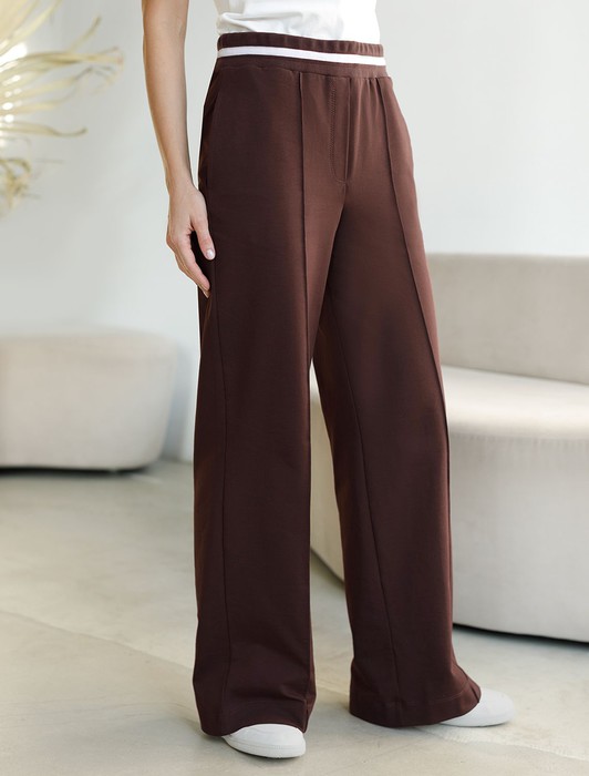 Состав: 95%Хлопок 5%ПУ Плотность: 240 Г/м2Брюки коричневого цвета с удобным эластичным поясом на резинке и карманами по бокам выполнены из премиального футера-двухнитки плотностью 240 Г/м2. Наличие эластана в составе гарантирует комфорт и долговечность изделия, материал хорошо пропускает воздух, позволяя телу дышать. Свободный прямой крой обеспечивает свободу движений и максимальное удобство в любых ситуациях, поэтому они подойдут и на большие размеры, а так же на высокий или низкий рост. Фигура подчеркивается, а силуэт визуально вытягивается за счет кроя палаццо и застроченных декоративных стрелок. В повседневных трикотажных брюках вы будете чувствовать себя комфортно и уверенно, наслаждаясь каждым моментом дня. Спортивные брюки подходят для демисезонного использования, в летний период, для занятий спортом в помещении и на улице, а также как часть стиля casual.