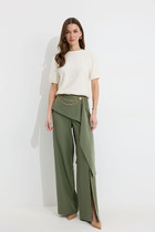Брюки прямого силуэта с имитацией запаха на притачном поясе. По переду застежка на тесьму-молнию. По боковым действующие карманы.